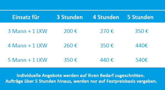Alternativ können wir gemeinsam mit Ihnen ein Festpreisangebot vereinbaren. Hierfür empfehlen wir Ihnen eine kostenlose und unverbindliche Besichtigung zu buchen. Dadurch lässt sich der Aufwand beim Umzug am besten einschätzen.
